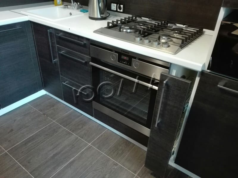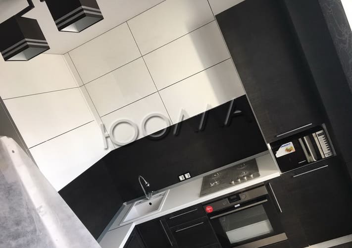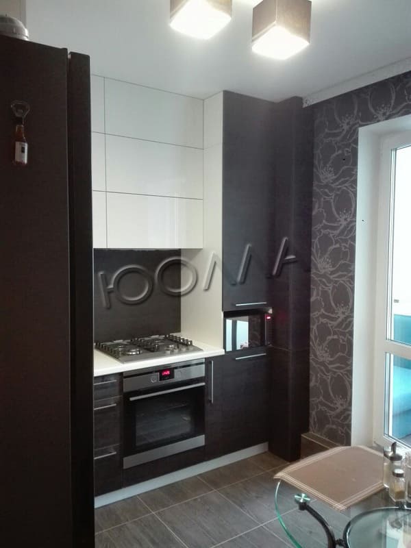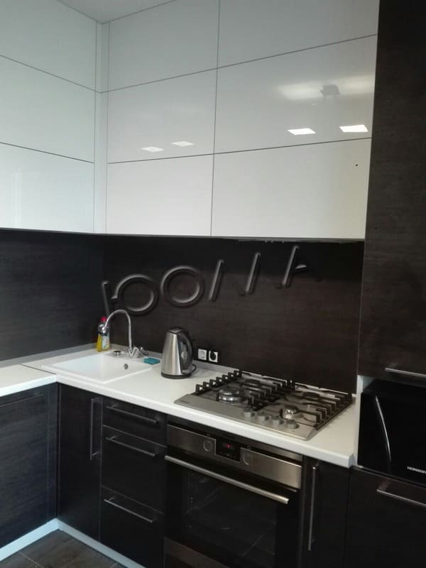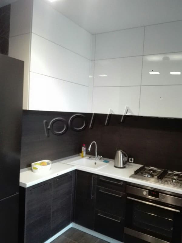 Контрастный угловой кухонный гарнитур из белого глянца и темной древесной фактуры. Фартук изготовлен в тон темному фасаду низа, мягко чередуясь с белой столешницей. Торцевой шкаф с нишей для печи СВЧ.