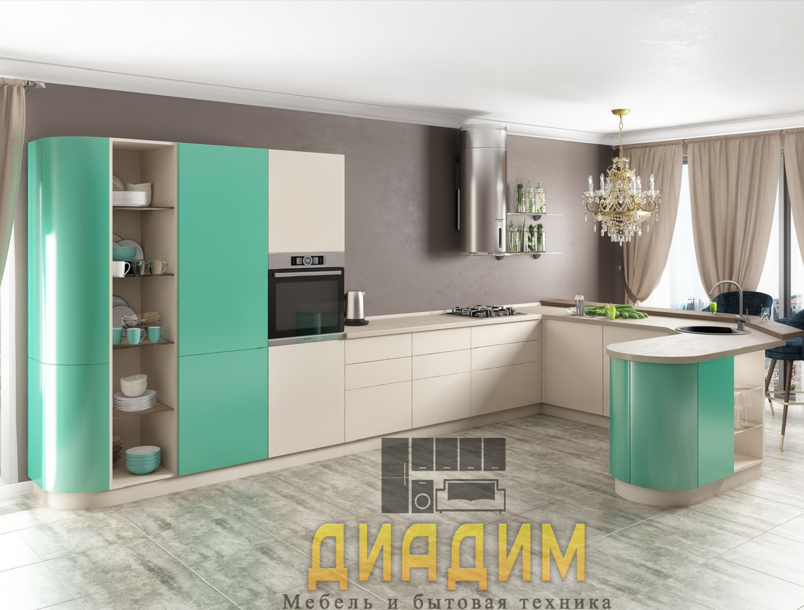 Кухне характерна П-образная форма с округлением по бокам. Сочетание бежевых и светло-зеленых фасадов смотрится гармонично и современно. Данная модель подойдет как для студии или офиса, так и для просторной квартиры.