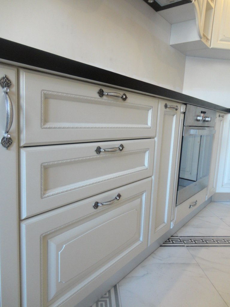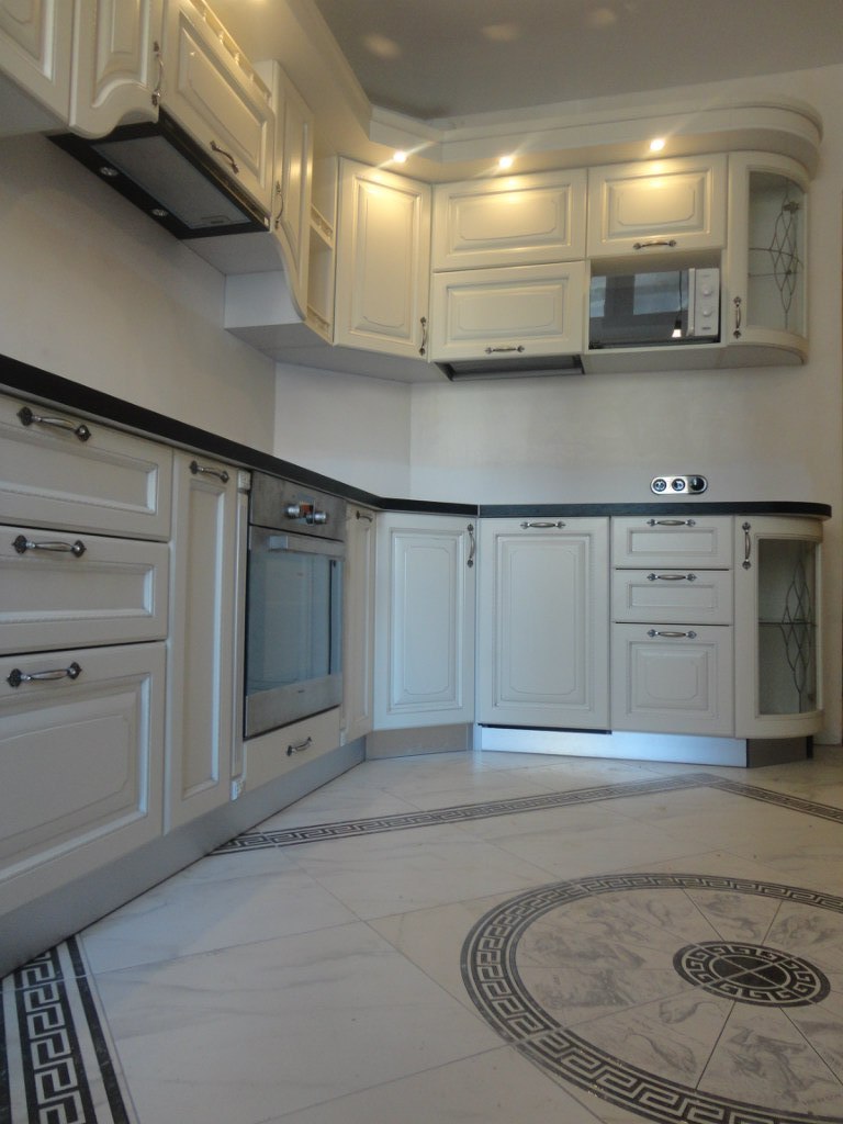 Фасад белого цвета органично дополняет глянцевую столешницу черного цвета.