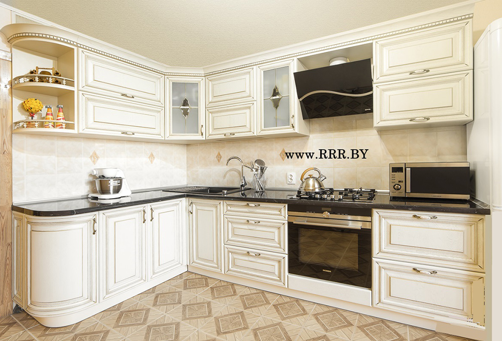Аккуратный угловой кухонный гарнитур в белой эмали, выполнен в стиле Прованс с элегантными филенками и резным декором в патине. Радиусный торец со стеллажом вверху. Также верхний фасад украшен рамными витринами с витражным рисунком из прозрачного и матового стекла, дверца угла диагональная. Столешница под черный глянцевый камень.