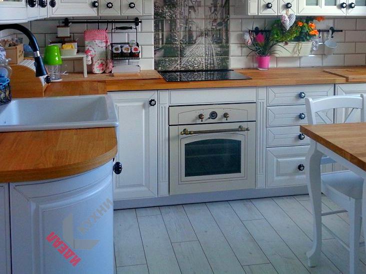 Однотонный древесный цвет фасадов из ЛДСП. Ширина кухни 200 см.