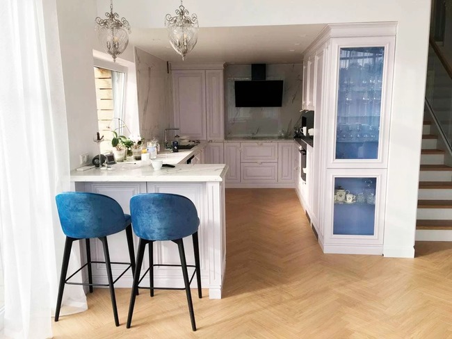 Современная угловая кухня с белыми глянцевыми фасадами без ручек