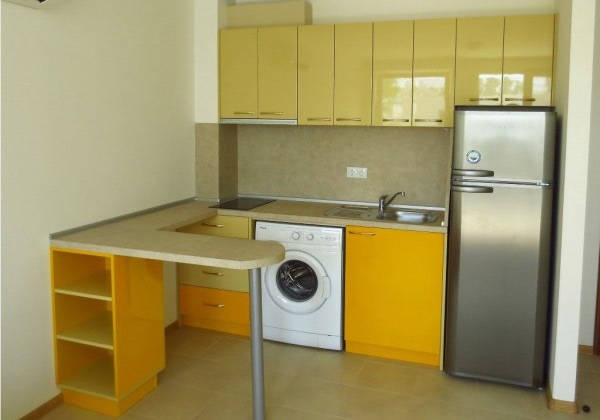 Линейная кухня, имеющая компактные размеры, представлена в современных лимонных тонах. Дополнительным преимуществом модели является наличие удобной барной стойки с несколькими открытыми полочками. Глянцевые фасады функциональной и практичной в использовании кухни оснащены металлическими ручками, покрытыми хромом.