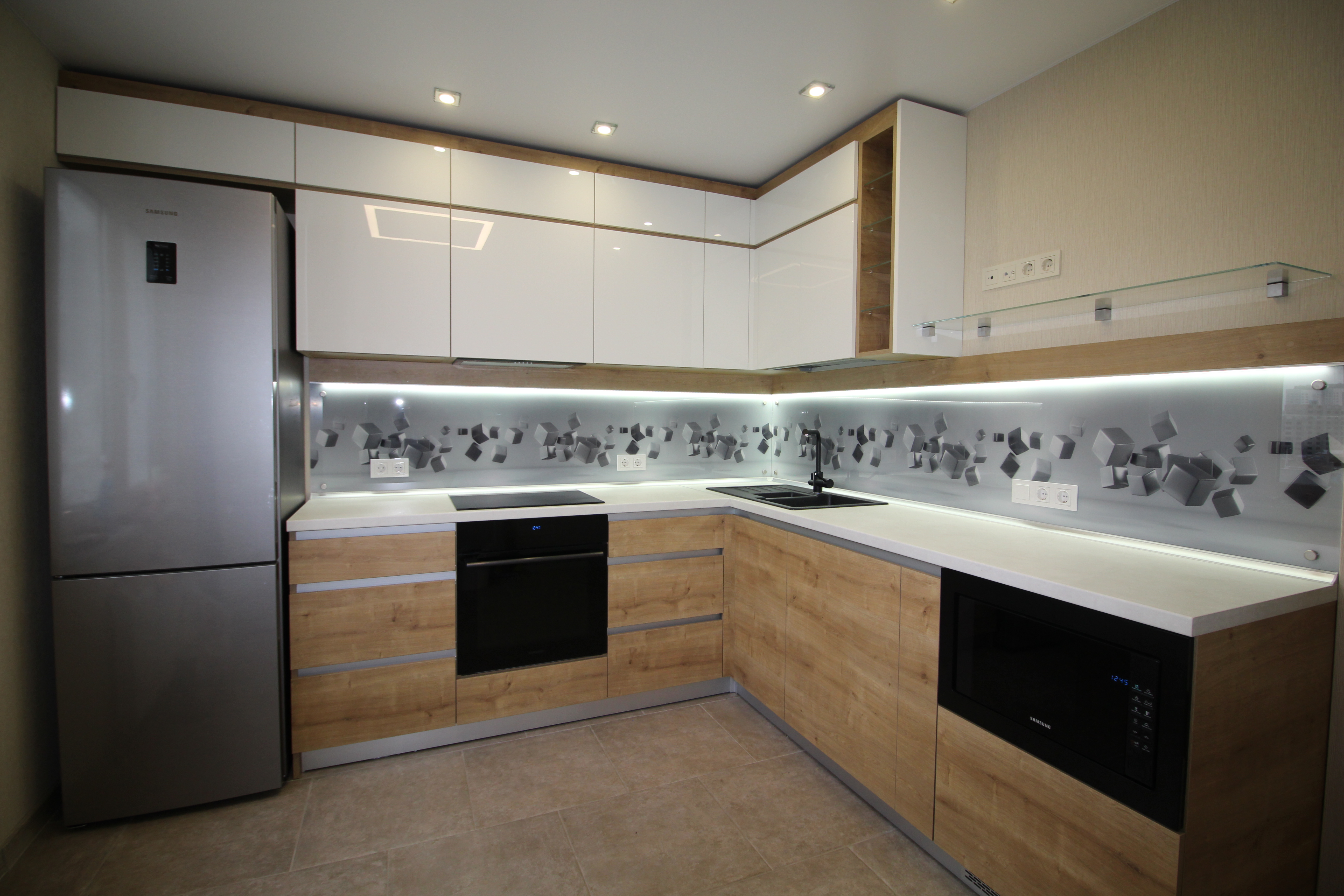 Угловая кухня в несколько брутальном современном скандинавском стиле сочетает в себе белоснежные акриловые и фасады из натуральной светлой древесины.