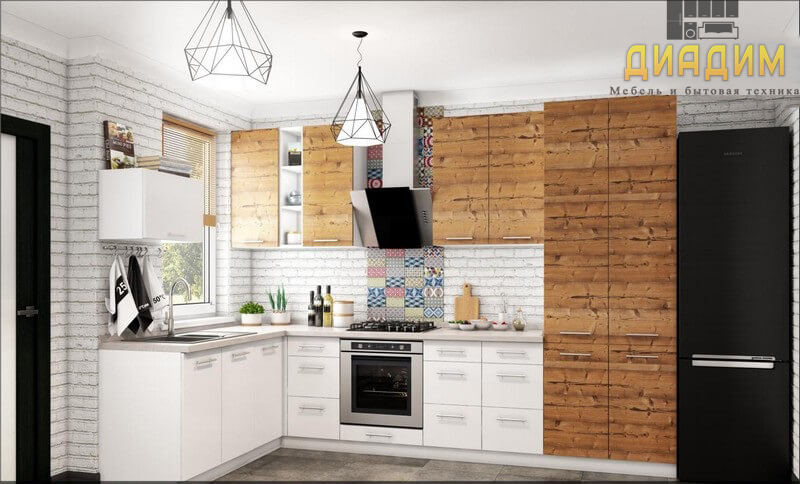 Угловая кухня для небольших помещений. Фасады оформлены спокойным сочетанием белого цвета и фактуры дерева. Вертикальное расположение верхних шкафов. Для ящиков используется направляющие с механизмами b-box.