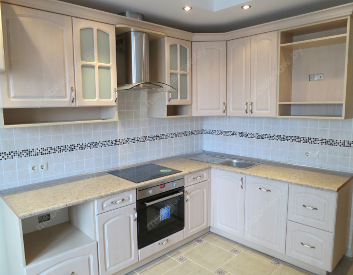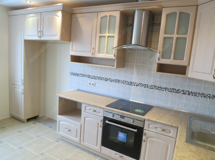 Светлая уютная классическая кухня с нишей для ТВ и микроволновки. Багетный карниз добавляет элегантности, гармонируя с общим стилем фрезеровки. Большой выбор вариантов фрезеровки, цвета, патины с эффектом старения.