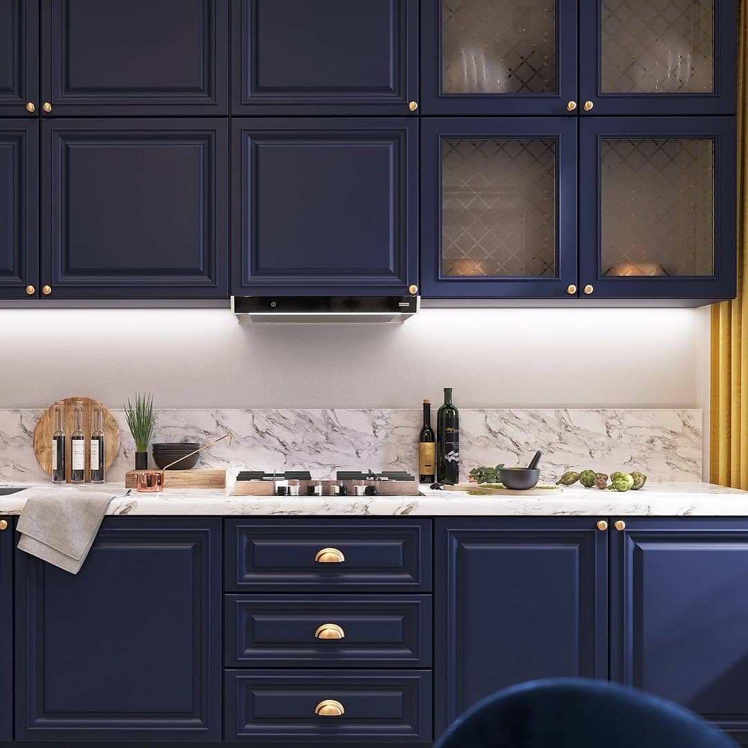 Однотонные матовые фасады с текстурой дерева, вставки из стекла.