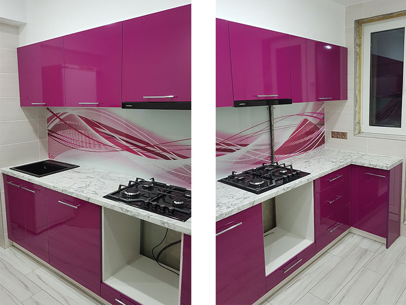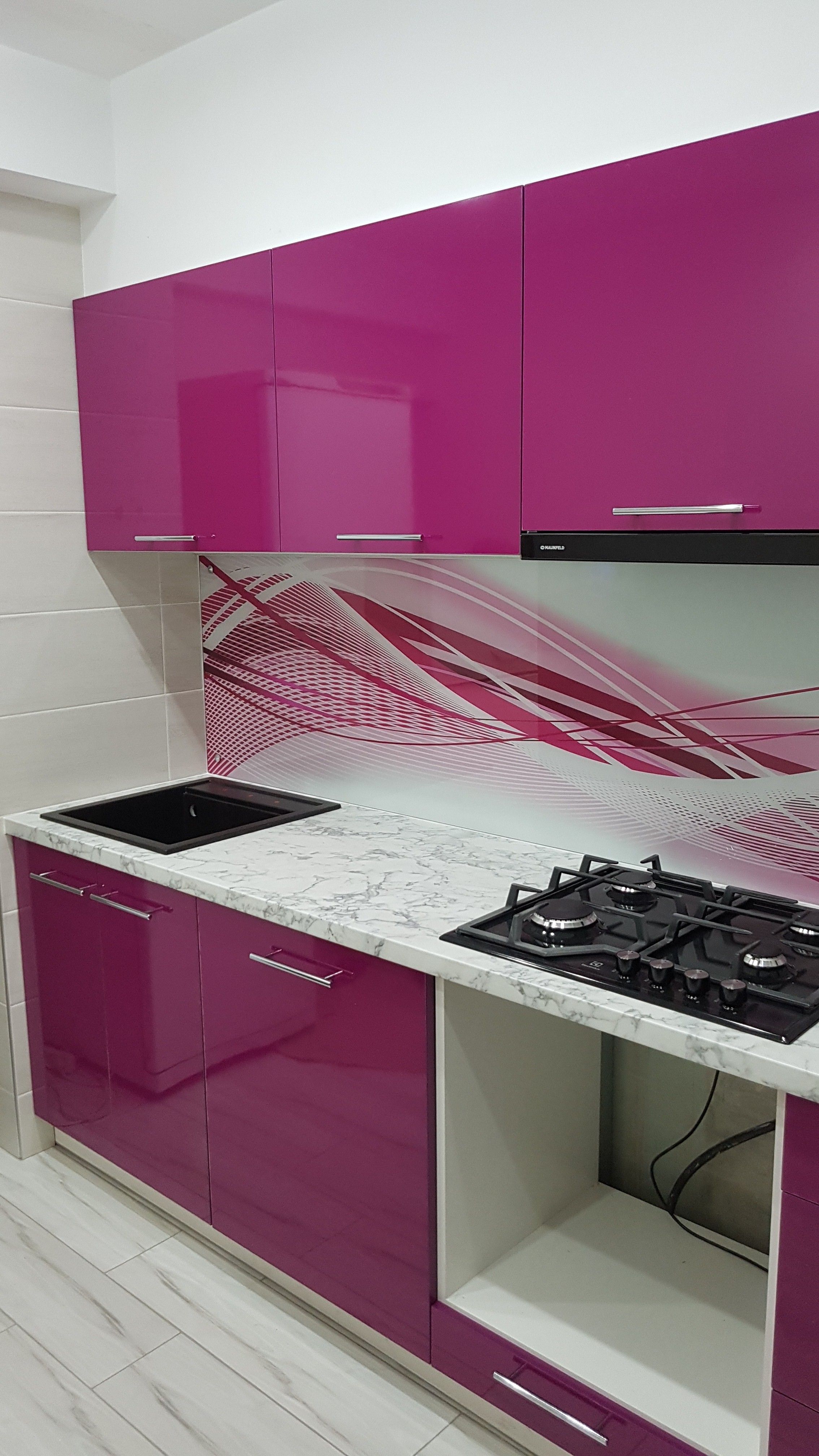 Современный кухонный гарнитур из крашенного МДФ. Вместительные шкафчики.