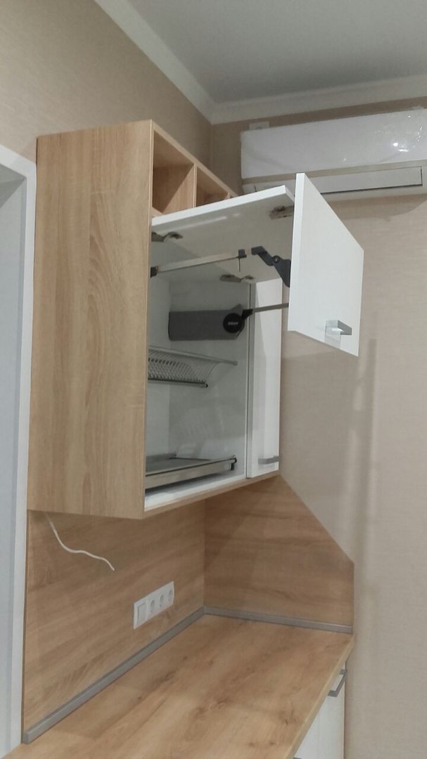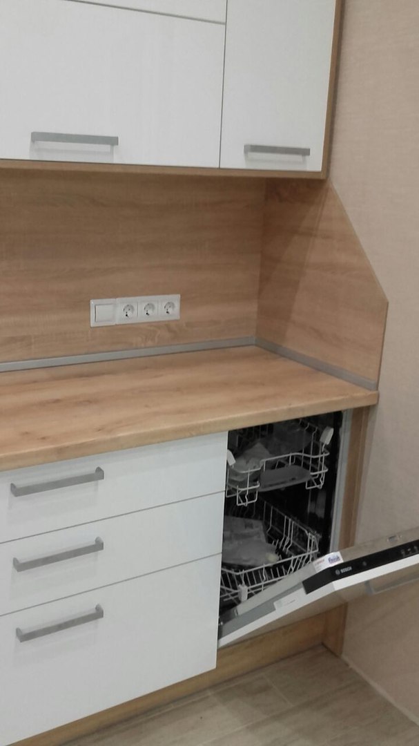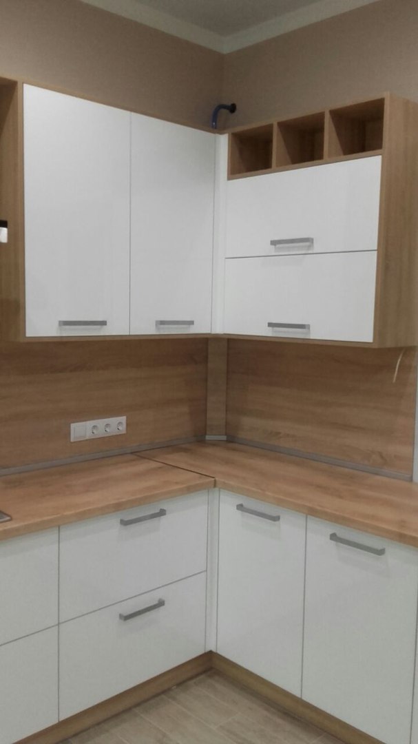 Фасады под дерево и белый глянец с прямоугольными ручками.