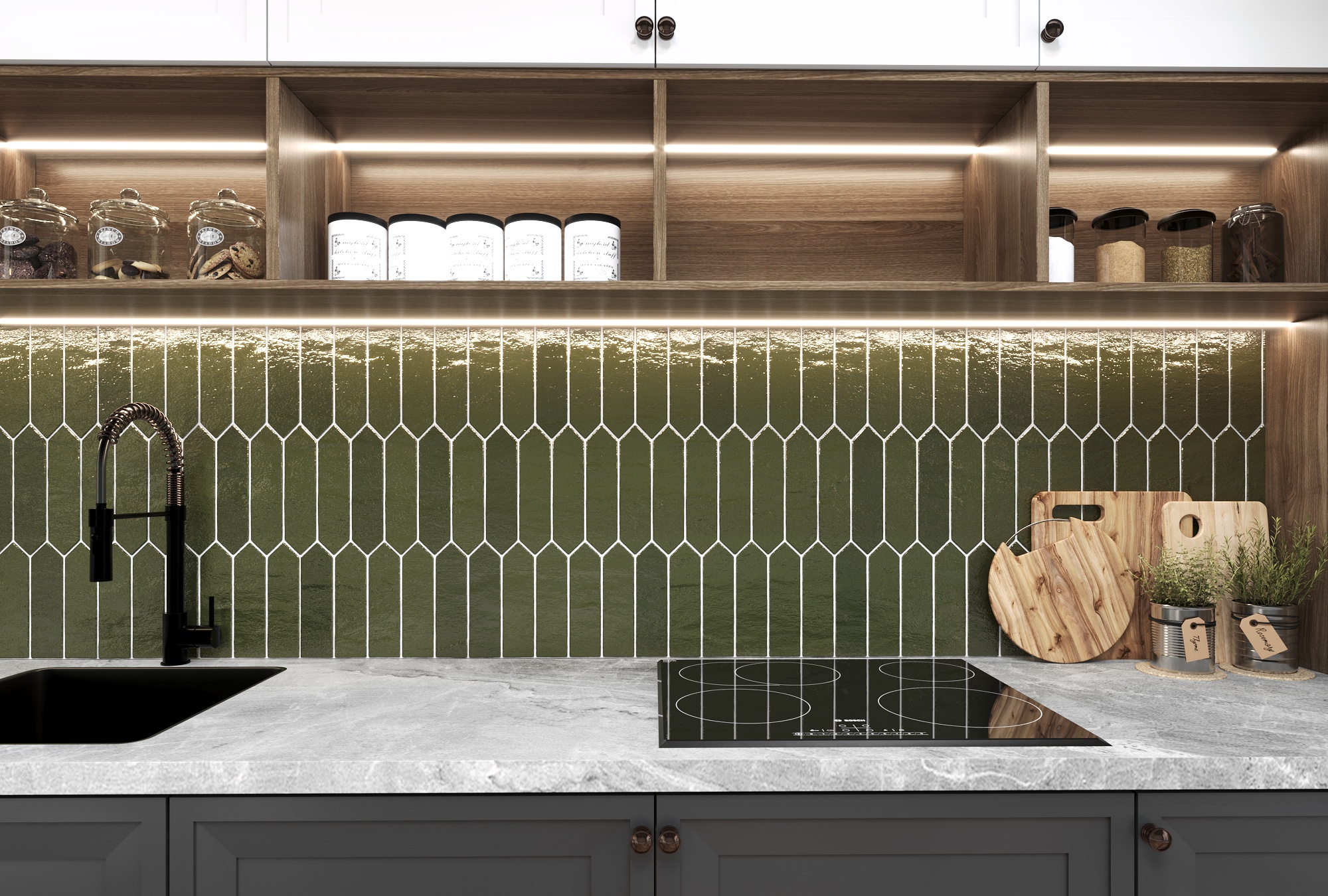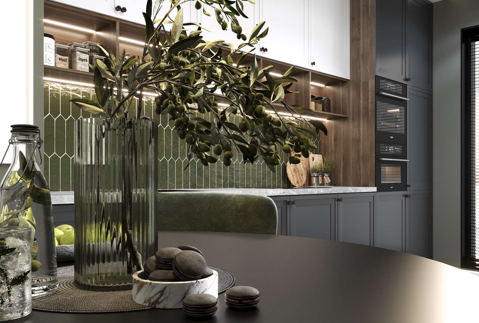 Верхние фасады со стеклом. Ширина кухни 230 см.