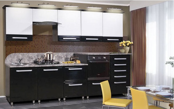 Такое сочетание способствует высокой влагостойкости, устойчивости к температурным перепадам и механическим повреждениям. Фасады выполнены в черном и белом цветах. Устанавливается кухня на хромированные ножки.