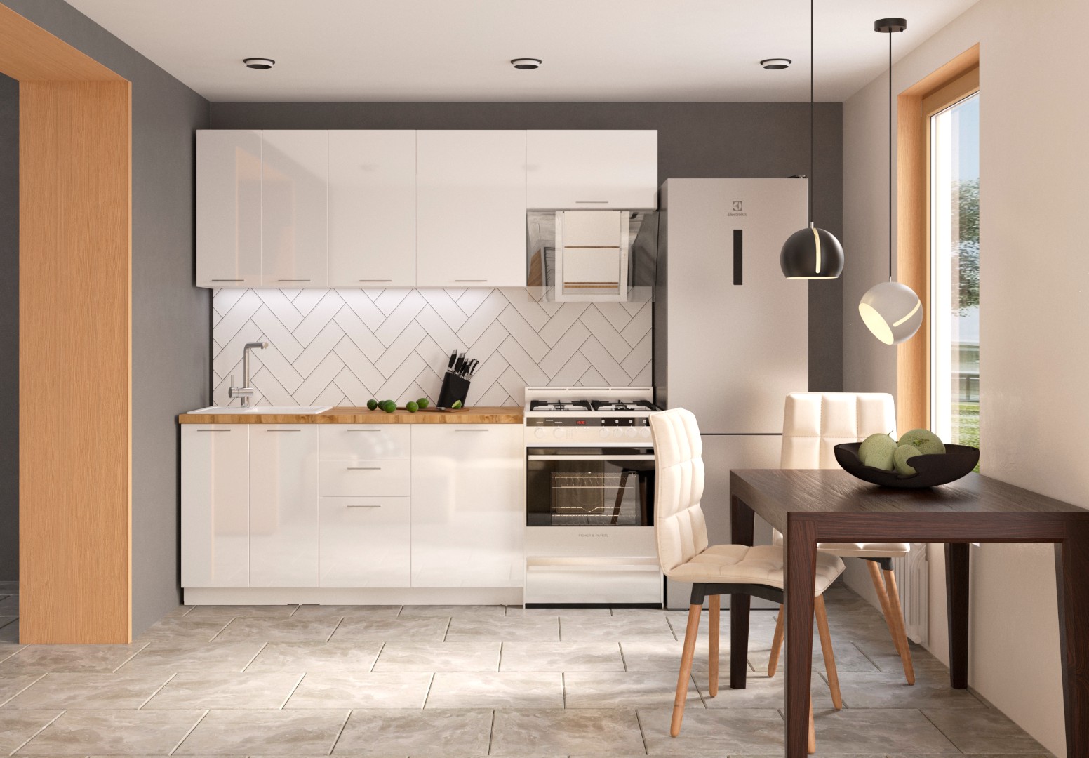 Белый тон фасадов в тандеме с древесным оттенком столешницы.