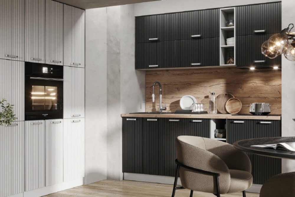 Удобная рабочая зона, фасады с фрезеровкой, витрины, пенал для техники.