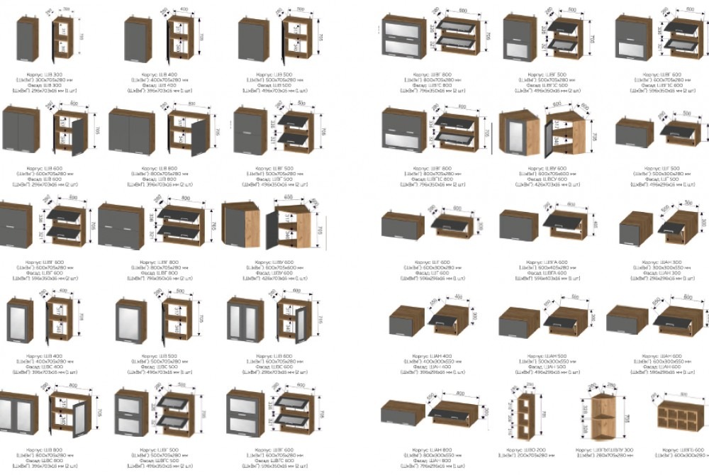 Модульная кухня с темными или светлыми фасадами. Большой выбор различных модулей позволяет «конструировать» кухню по Вашим пожеланиям. Размеры модулей верхних, нижних, пеналов найдете на фото под основной картинкой.