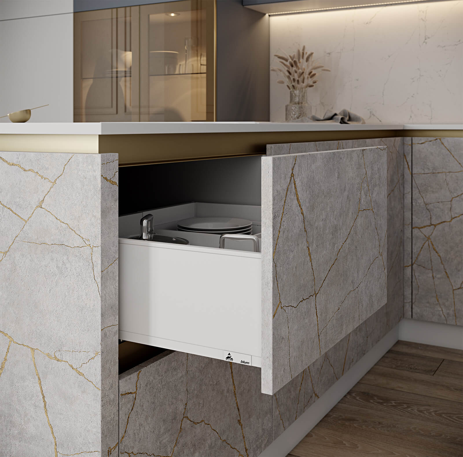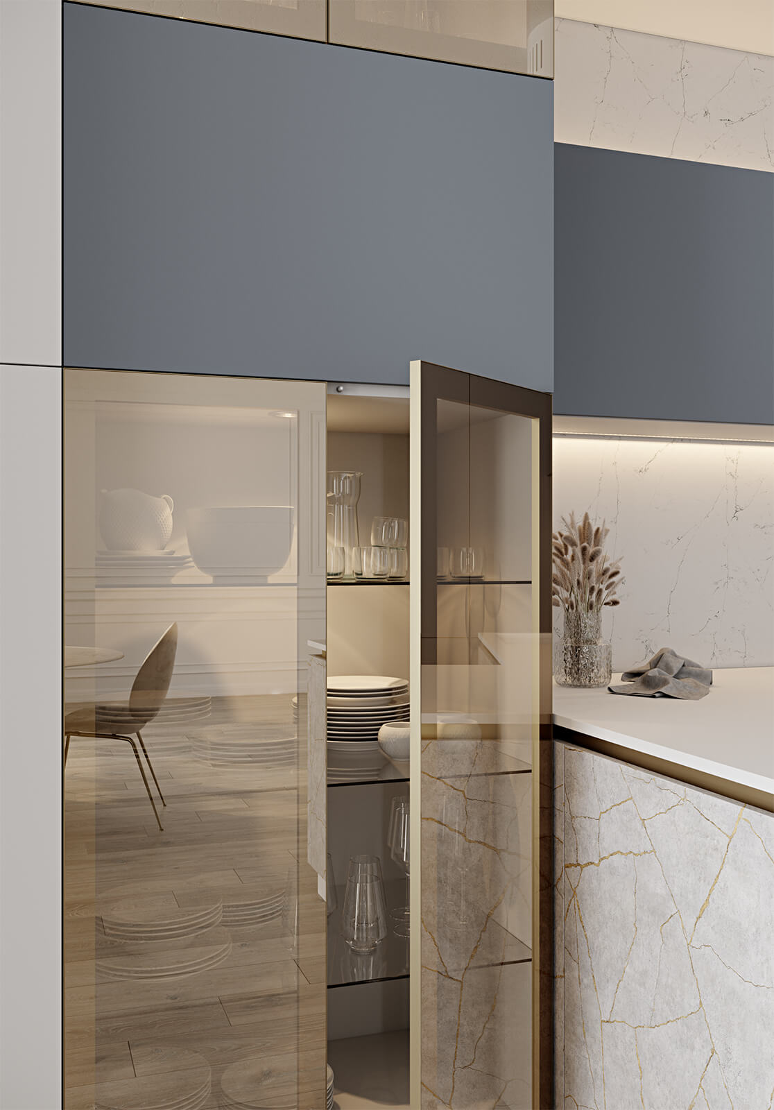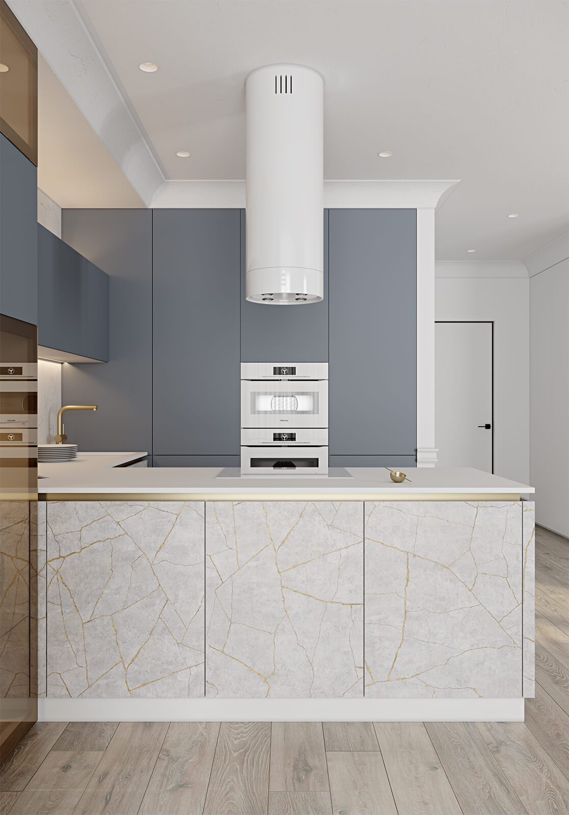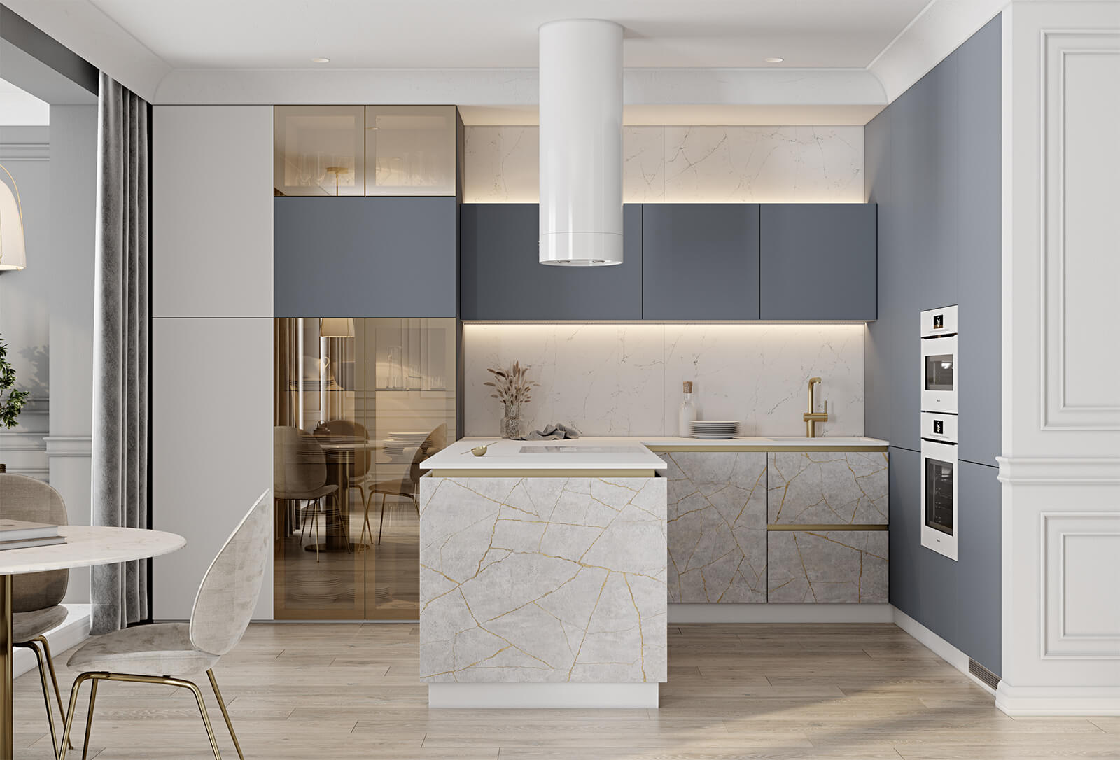 Фасады лдсп синкрон, декор венато бежевый / крашеная мдф, цвет ncs s 4020-r90b матовый / акрил fenix ntm, цвет белый ntm (0032) столешница акрил fenix ntm, 20 мм, цвет белый ntm (0032)