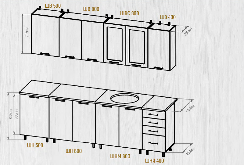 Выполняются кухни шириной 1,6/2,0/2,5/2,6 метра.