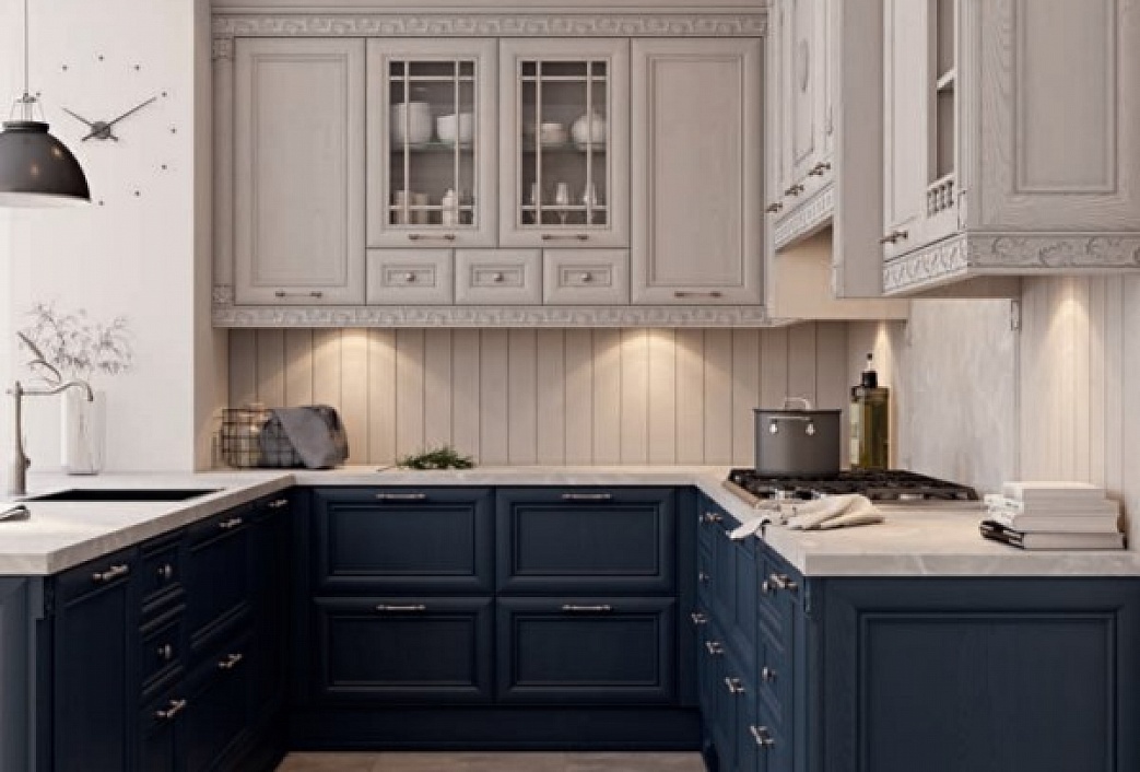 Отделка фасадов в двух цветах. Ширина кухни 160 см.