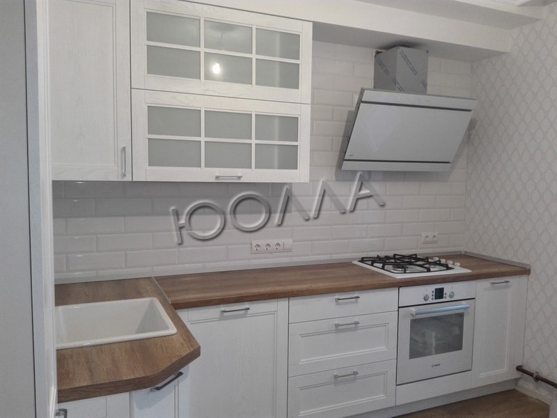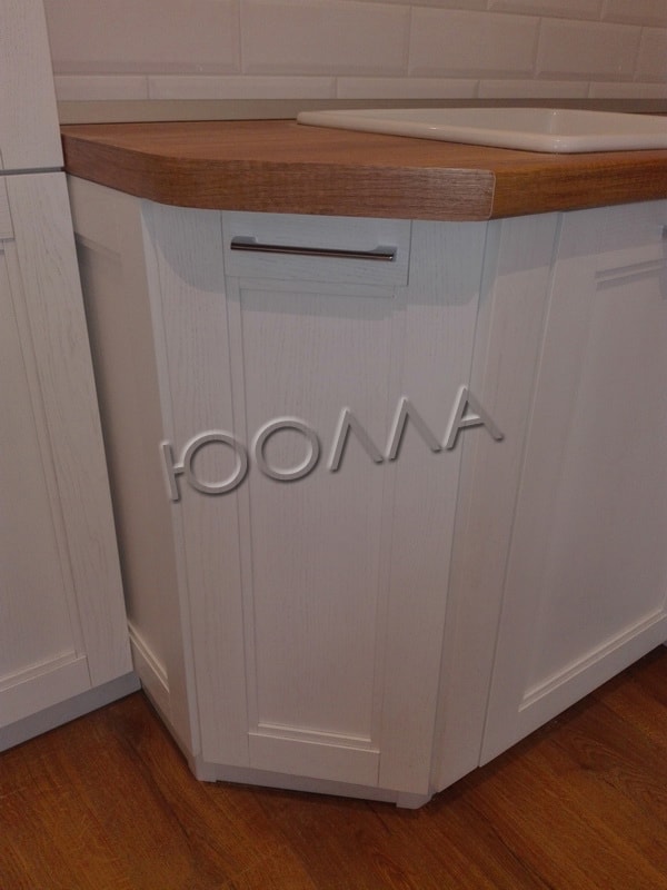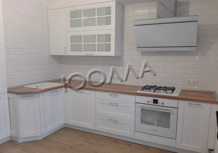 Стильная минималистичная угловая кухня с белыми филенчатыми фасадами из крашенного массива дуба. Навесная витрина из полупрозрачного стекла лакомат удобной подъемной складной конструкции. Столешница ламинирована в естественных тонах дерева.