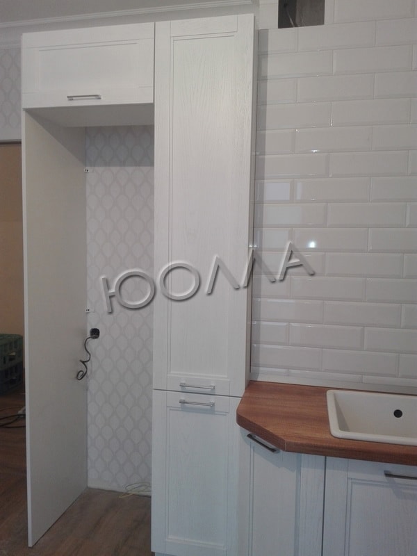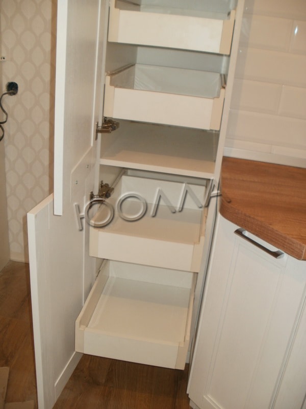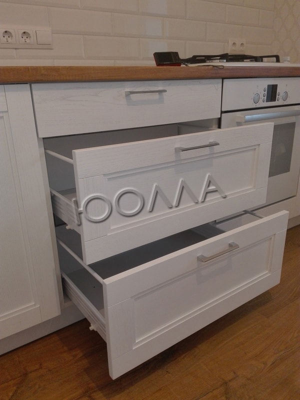 Кухня изготовлена со скрытыми креплениями и фурнитурой по немецкой технологии "Фолдинг".