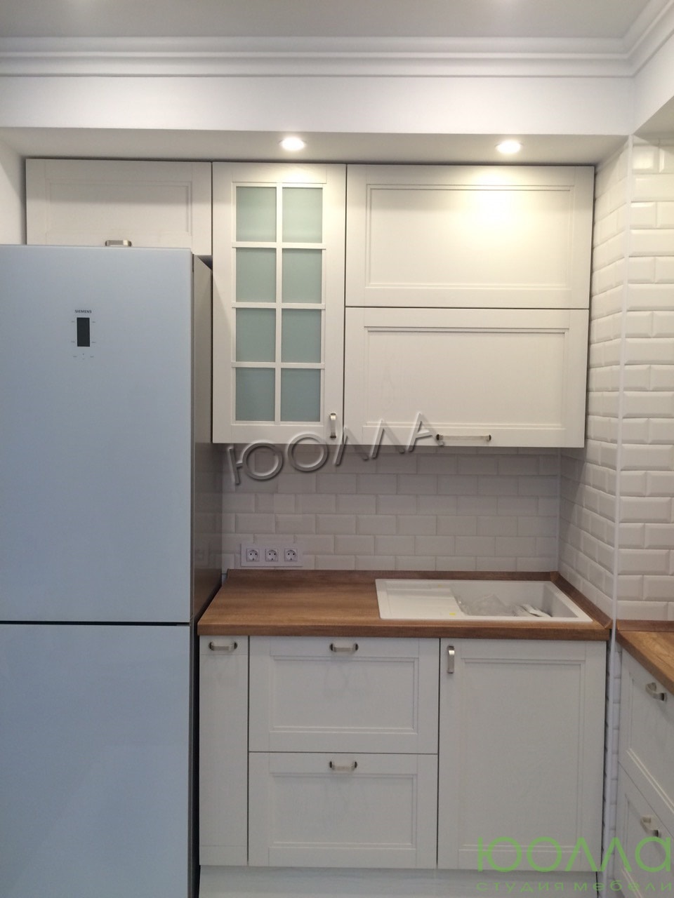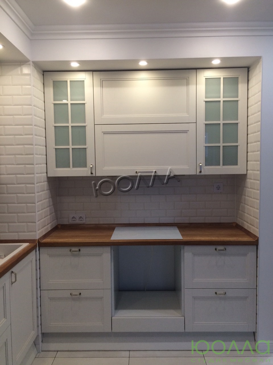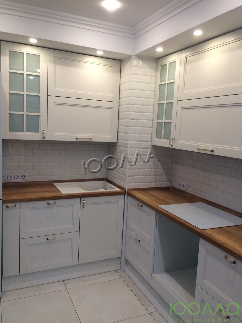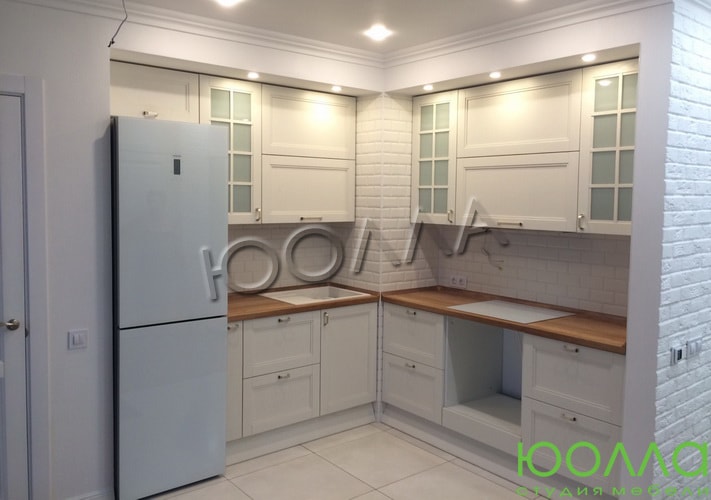 Угловой кухонный гарнитур в скандинавском стиле: белые фасады с филенками и витринами из лакомата, столешница под светлое дерево разделена выступающим углом помещения на две рабочих поверхности. Есть ниша для холодильника. Кухня изготовлена из натурального массива со скрытыми креплениями и фурнитурой по немецкой технологии "Фолдинг".