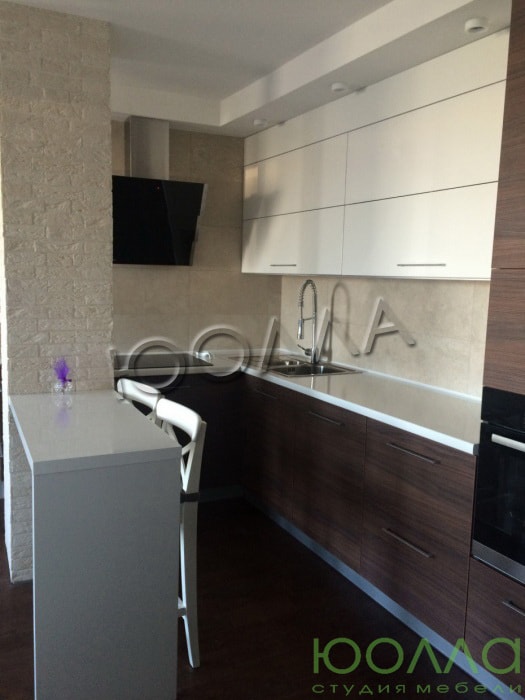 код 89646Компактная двухцветная угловая кухня с барной стойкой.