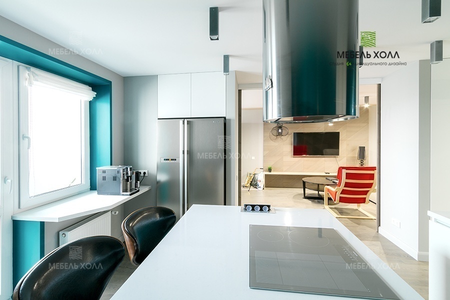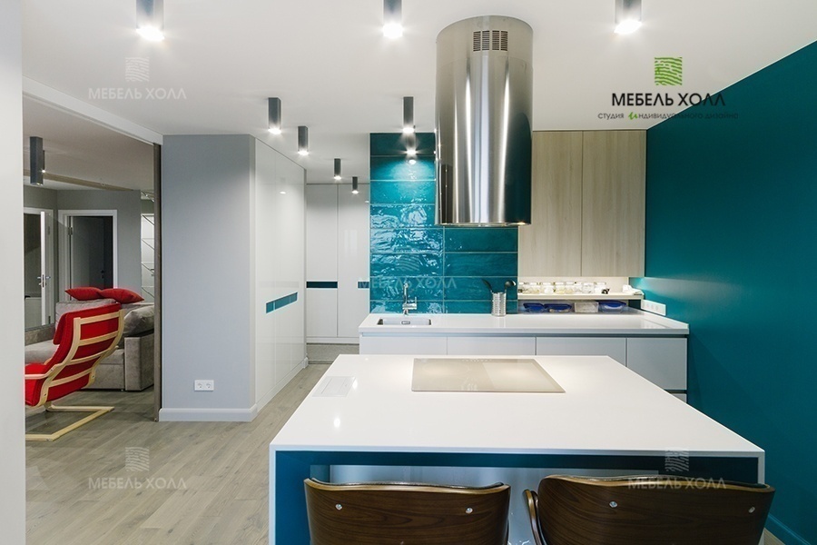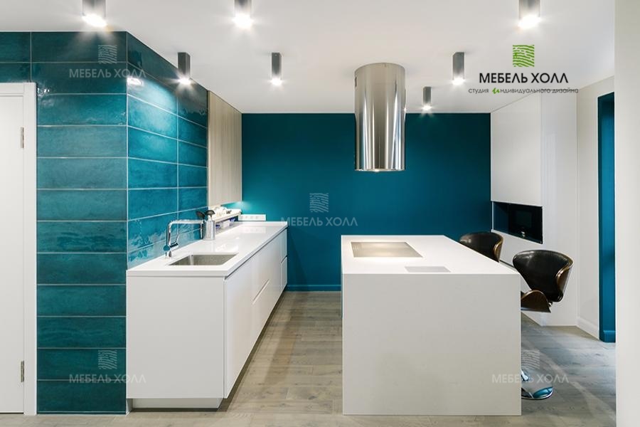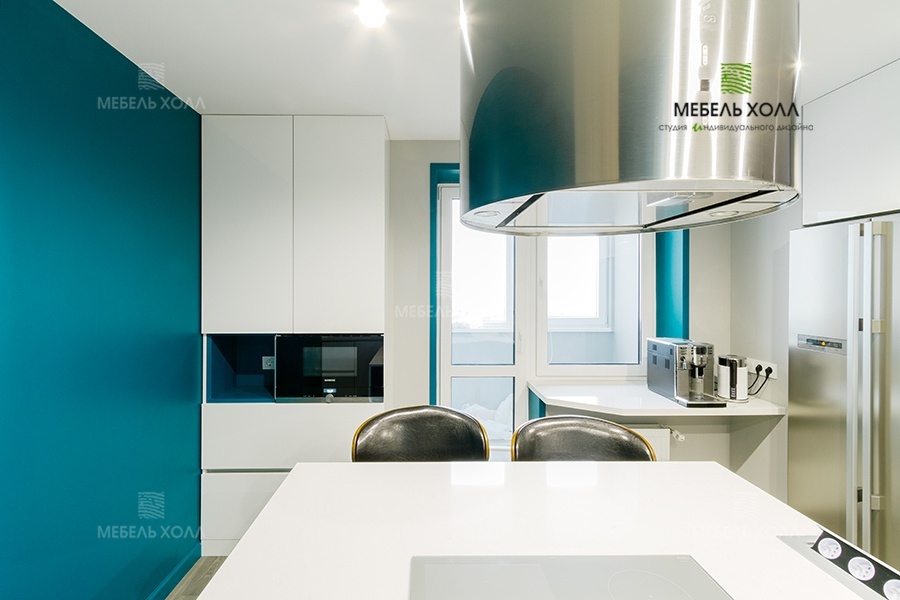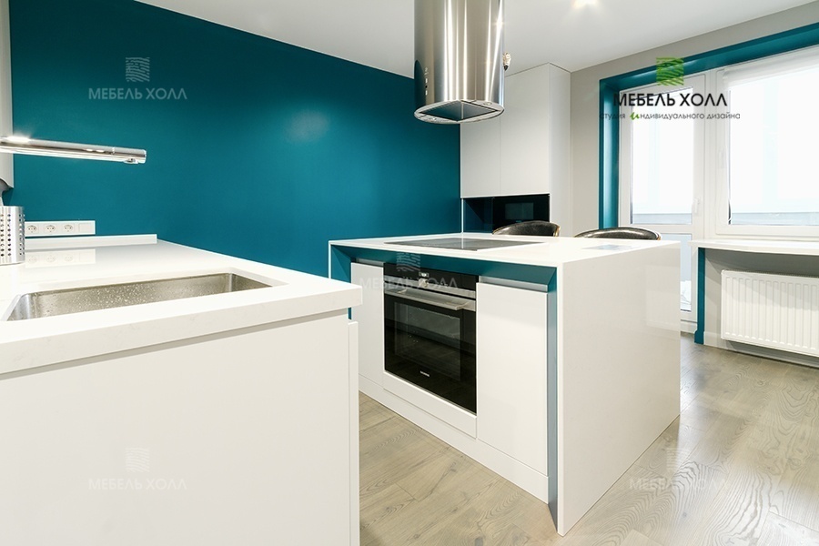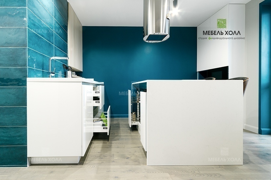 Стильная современная кухня из крашенного в белый глянец МДФ с фурнитурой Blum.