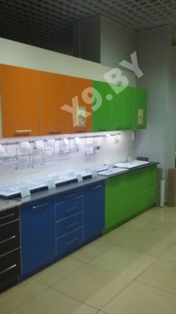 Однотонный древесный цвет фасадов из ЛДСП. Ширина кухни 220 см.