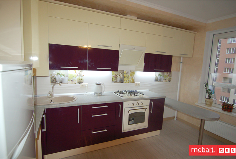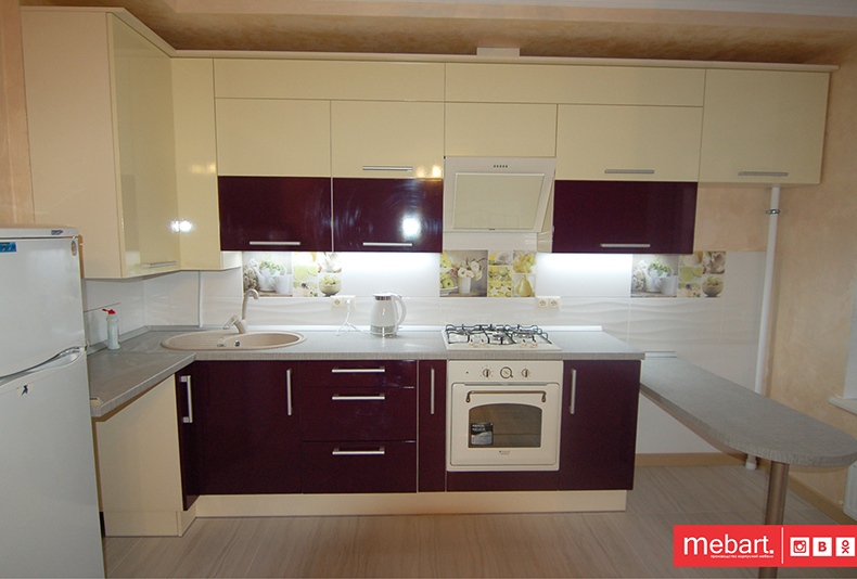 Стильная угловая кухня с глянцевым фасадом окрашена в белый и бордовый цвета. Створки оснащены металлическими ручками, покрытыми хромом. С двух сторон конструкция укомплектована небольшими стойками. Предусмотрено также наличие подсветки.