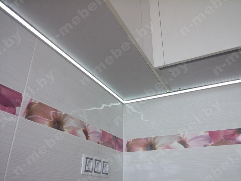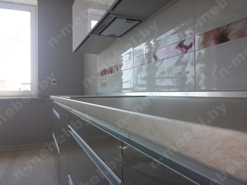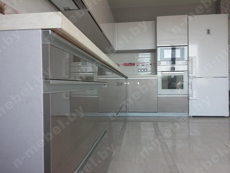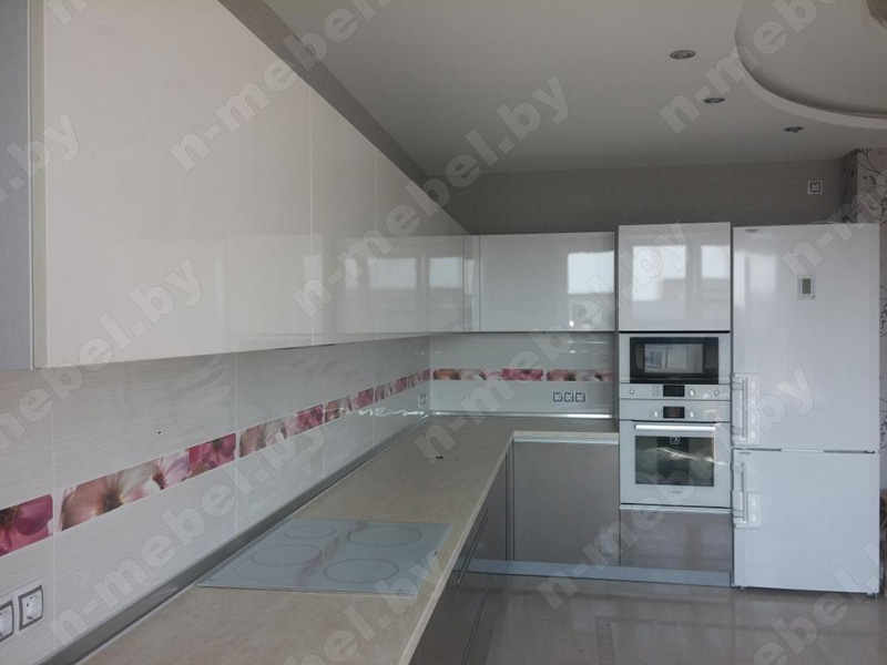 Стильная угловая кухня отличается превосходной вместительностью за счет множества шкафчиков и выдвижных ящиков. Гарнитур со светлыми скинали, украшенными цветочным орнаментом, отлично подойдет для обустройства просторной светлой кухни. Глянцевый фасад верхних шкафчиков представлен в белом тоне, а нижние модули окрашены в платиново-серый цвет. Для удобной эксплуатации часть напольных шкафчиков оснащена металлическими врезными ручками.