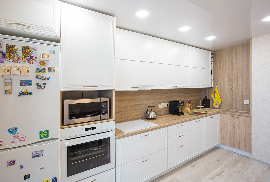 Минималистичная кухня от фабрики ЗОВ с комбинированными фасадами из шпона и пластика.