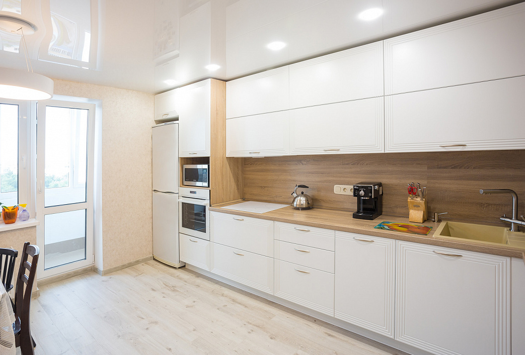 Удобные металлические ручки в цвете «сатин». Ширина кухни 140 см.