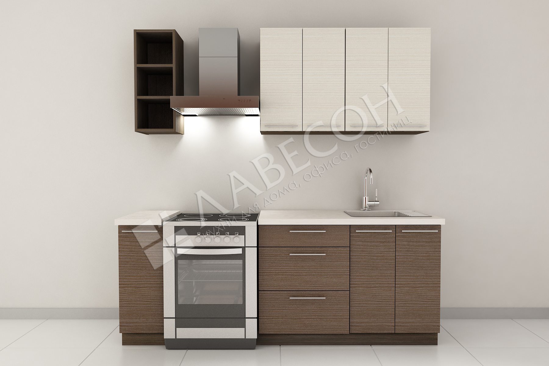 Двухметровая кухня с фасадами из ЛДСП двух цветов.