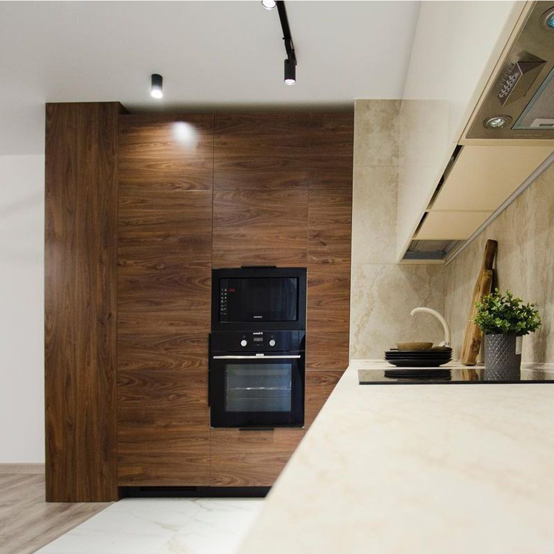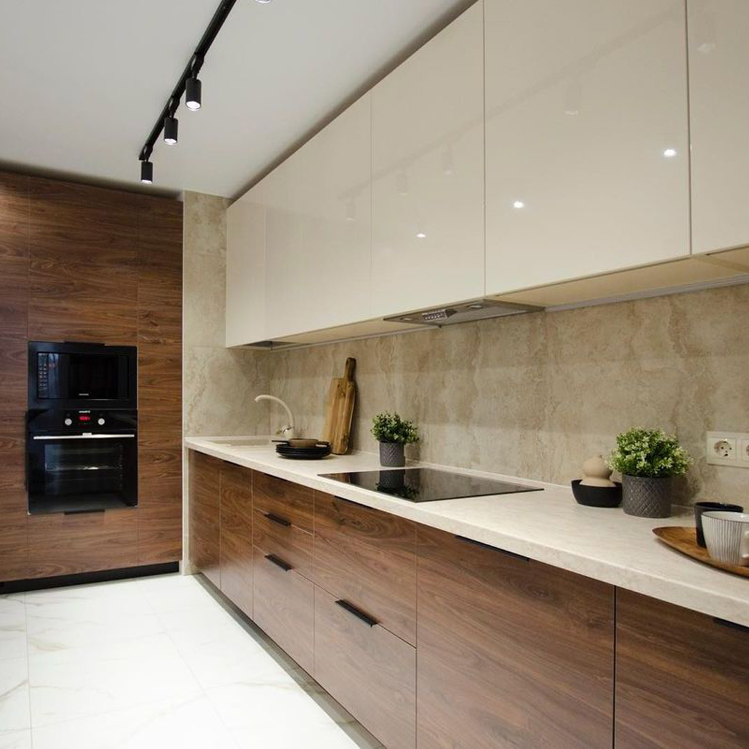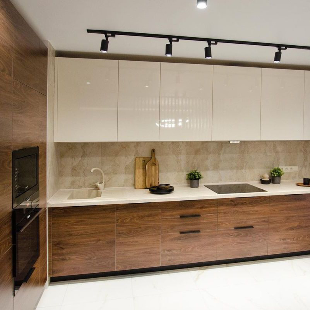 Глянцевое покрытие фасадов. Ниши для кухонной техники.