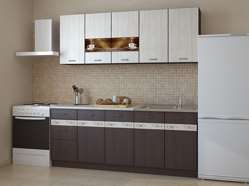 Компактная кухня «Вяселка 2/1» оформлена в комбинированные цвета фасада с использованием стильного фотопринта с изображением зернового кофе на верхнем модуле. Нижний модуль декорирован полоской с цветочным рисунком. Столешница постформинг устойчива к порезам и царапинам, а также к химической чистке.