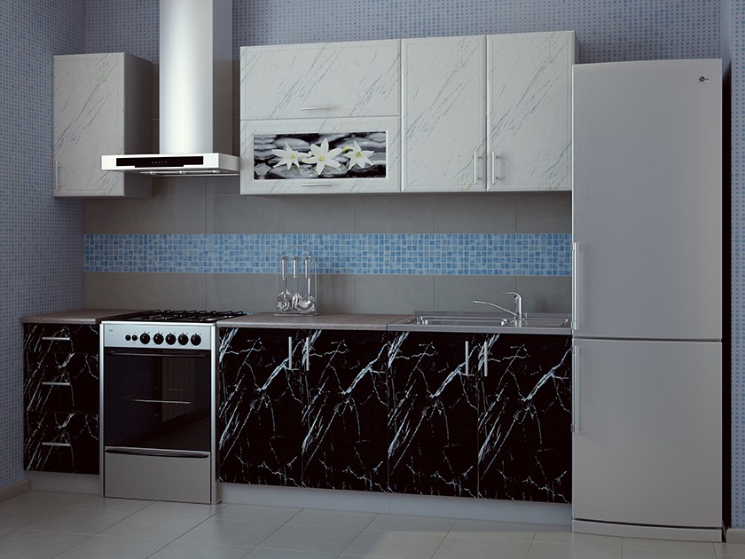 Компактный lde[vtnhjdsq прямой кухонный гарнитур с серой столешницей под накладную раковину. Верх ламинирован под белый мрамор, имеет модуль, остекленный лакобелем с цветочным фотопринтом. Низ под темный камень.