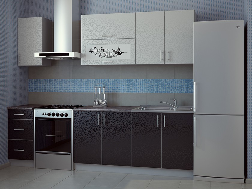 Компактный прямой кухонный гарнитур с глянцевым 3D-узором на фасаде. Серая столешница под камень для накладной раковины. Черный низ на два шкафчика и тумбу с выдвижными ящиками. Белый верх с остекленным лакобелем модулем с узором в виде силуэта птицы. Серый матовый серый цоколь, ручки рейлинги.