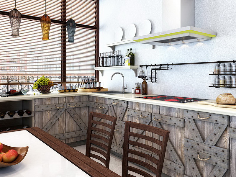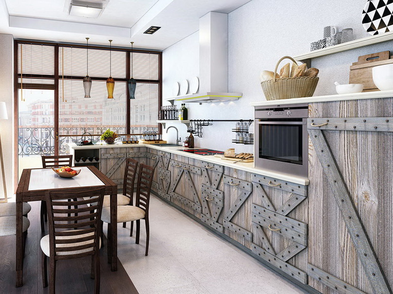 Древесная текстура, светлый верх и более темный низ фасадов.