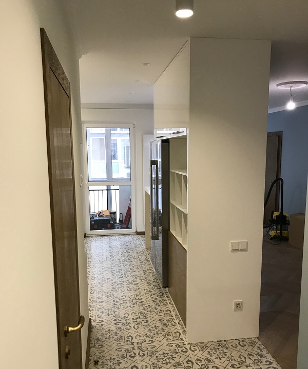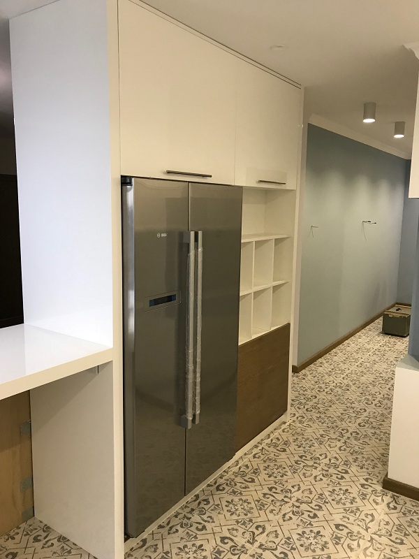Конструкция для холодильника side-by-side с навесными ящиками и декоративными полками отлично подходит для разграничения помещения в квартире студии.