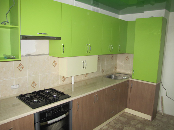 Кухня отличается ярким сочетанием цветов. Салатовые фасады удачно сочетаются с коричневыми. Помимо закрытых модулей, гарнитура также включает в себя открытые полочки. На них можно размещать различные предметы декора. Все элементы изготовлены из ДСП.
