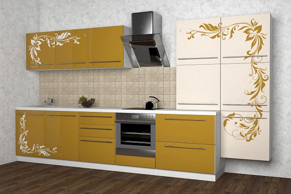 Сочный и яркий золотистый цвет фасадов делают эту кухню модной и актуальной. Красиво очень современно будет смотреться этот гарнитур в кухне с любыи интерьером. Дополнительно гарнитур комплектуется пеналом, который засчет вертикальной конструкции занимает мало места, но при этом отличается высокой вместительностью.