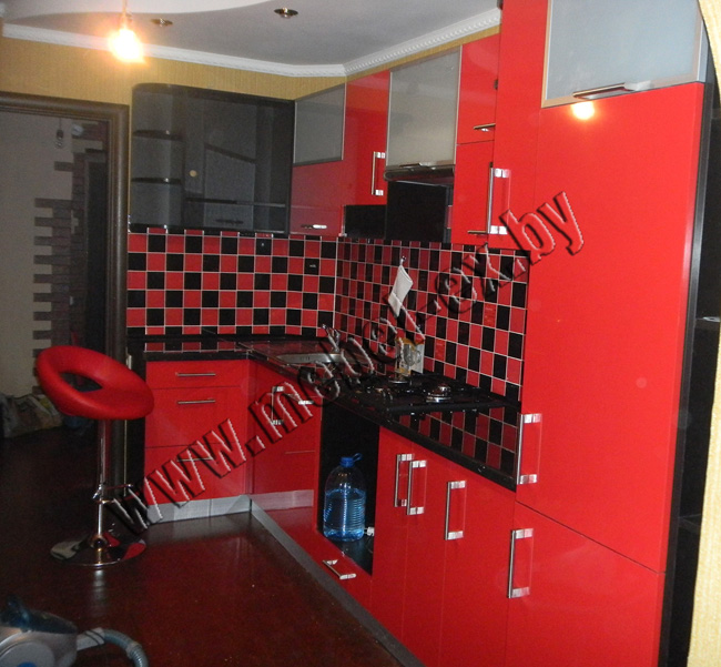 Рабочая стенка из плитки красного и черного цветов. Удобные металлические ручки.