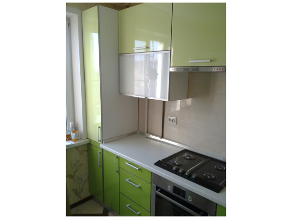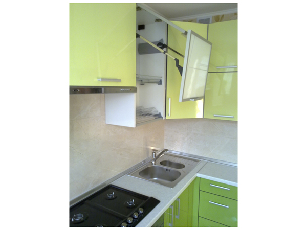 Шкаф для посуды имеет оригинальную систему открытия, дверь разделена на два сегмента и поднимается вверх.