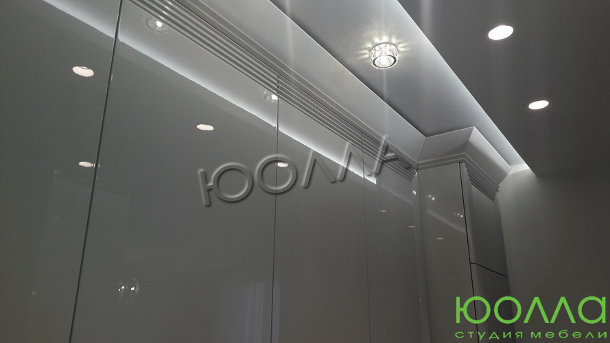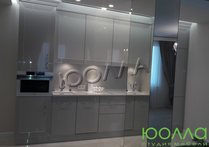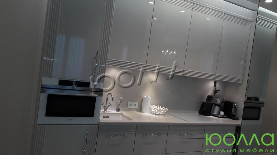 код 89624Кухня выглядит роскошно и в тоже время лаконично. Глянцевый фасад дымчатого оттенка с фрезеровкой.