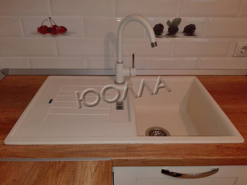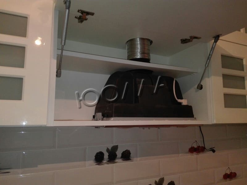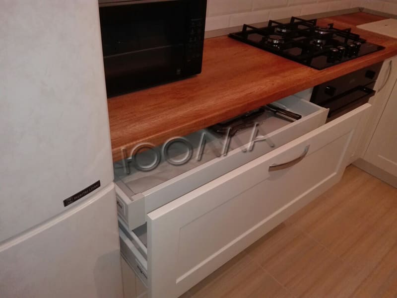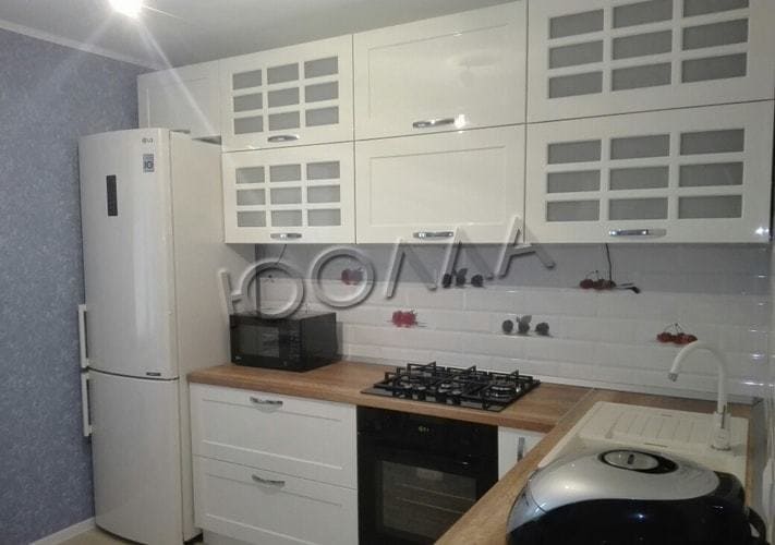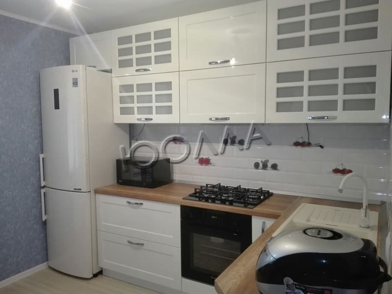 Фасады кухни «Жемчужина» выполнены в перламутрово белом цвете. Створки подвесных шкафчиков украшены стеклянными матовыми вставками. Столешница гарнитура изготовлена под светлое дерево. Кухня изготовлена со скрытыми креплениями и фурнитурой по немецкой технологии "Фолдинг".