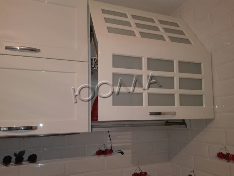 Белая кухня в классическом стиле с филенками и остеклением верха.