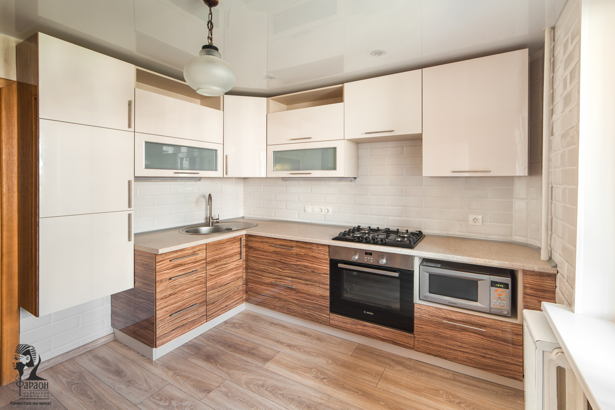 После утомительного тяжелого дня эта кухня встретит каждого своим теплом и уютом. Благодаря удачному сочетанию древесной и однотонной фактур, она приобретет неповторимый шарм изысканности. Яркая фактура нижних фасадов привнесет тепло и комфорт натурального дерева. Такая компоновка отлично подойдет для небольшой кухни в 7-9 м.кв.