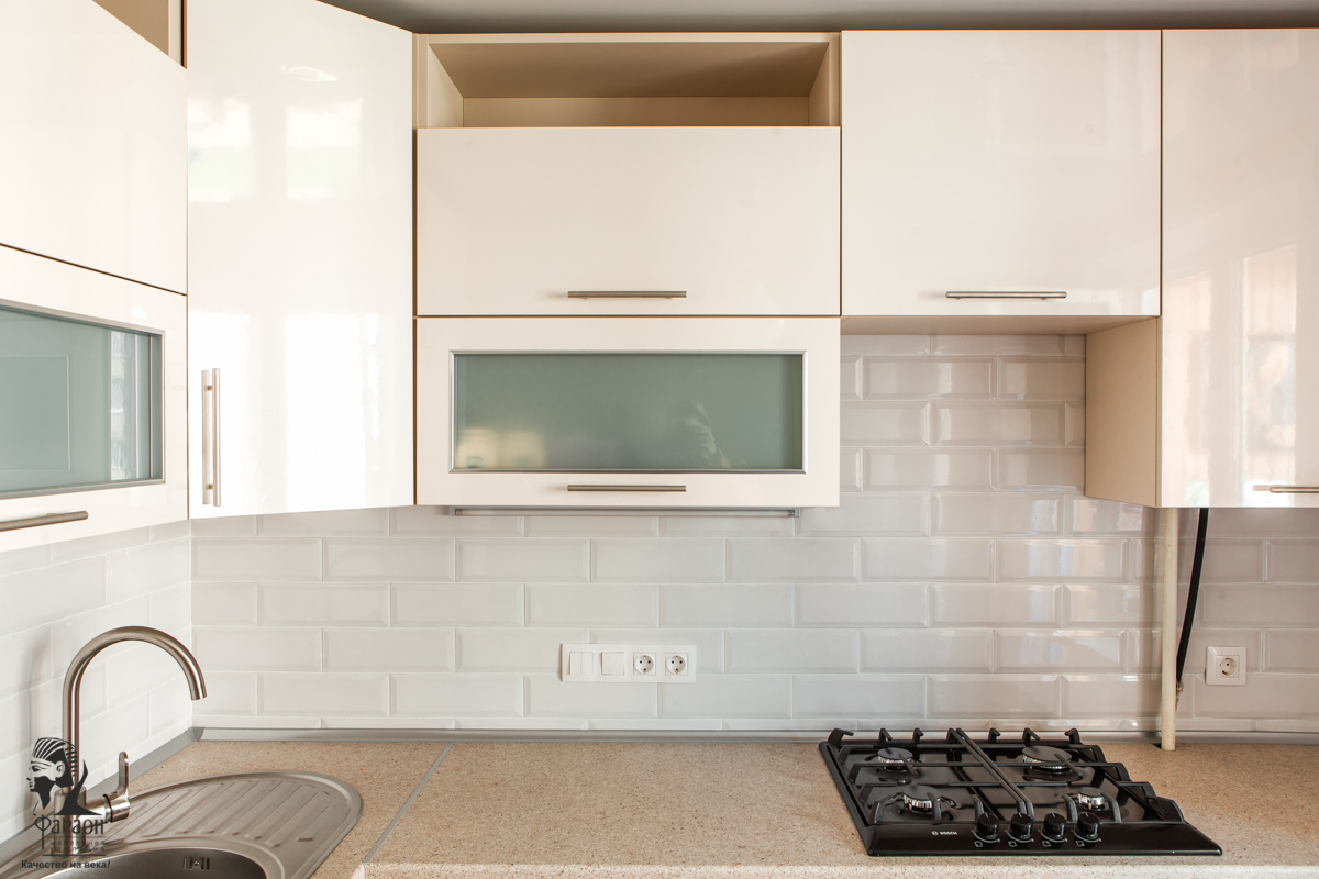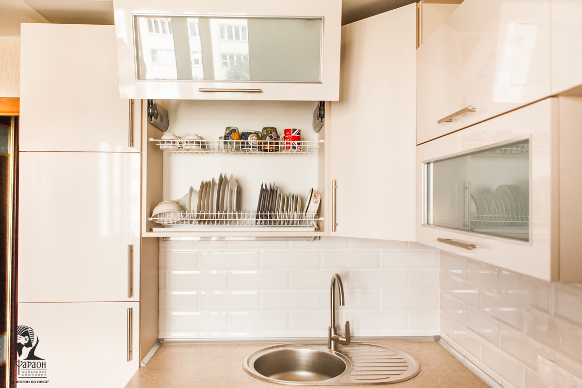 Высокие верхние шкафы позволят спрятать от посторонних глаз все кухонные принадлежности. И наконец, отличительной чертой станет навесной шкаф при входе. Его конструкция и внешний вид абсолютно и точно станут лаконичным завершением всего кухонного гарнитура.