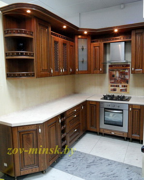 Угловая кухня выполнена из натурального массива ясеня и ольхи. Кухня имеет в комплекте открытые полочки и может быть оснащена карнизом со встроенной подсветкой. Створки шкафчиков оснащены небольшими металлическими ручками, удобными для каждодневного использования.