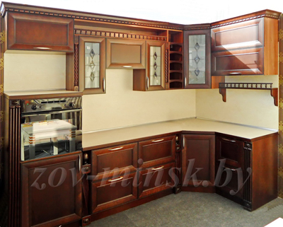 Кухня ЗОВ №23 «Массив ольхи» выполнена в изысканном классическом стиле. Корпус и фасады окрашены в насыщенный коричневый оттенок и покрыты слоем специального защитного лака.