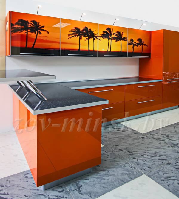 Фурнитура изготовлена из металла. Кухонный гарнитур декорирован фотопечатью с изображением пальм и заката.